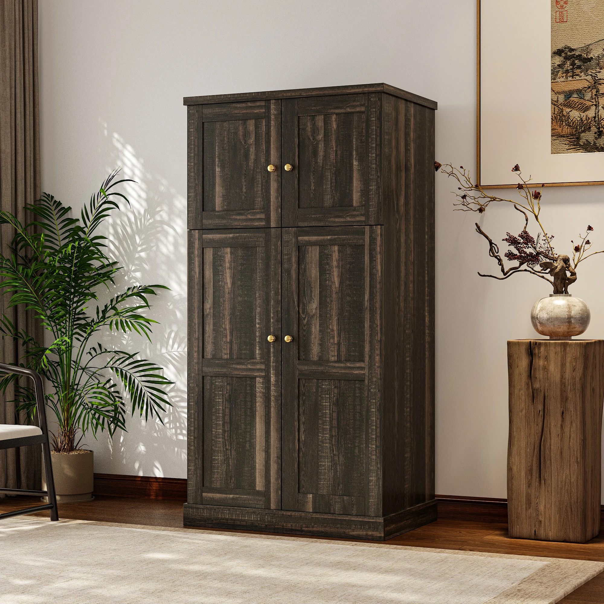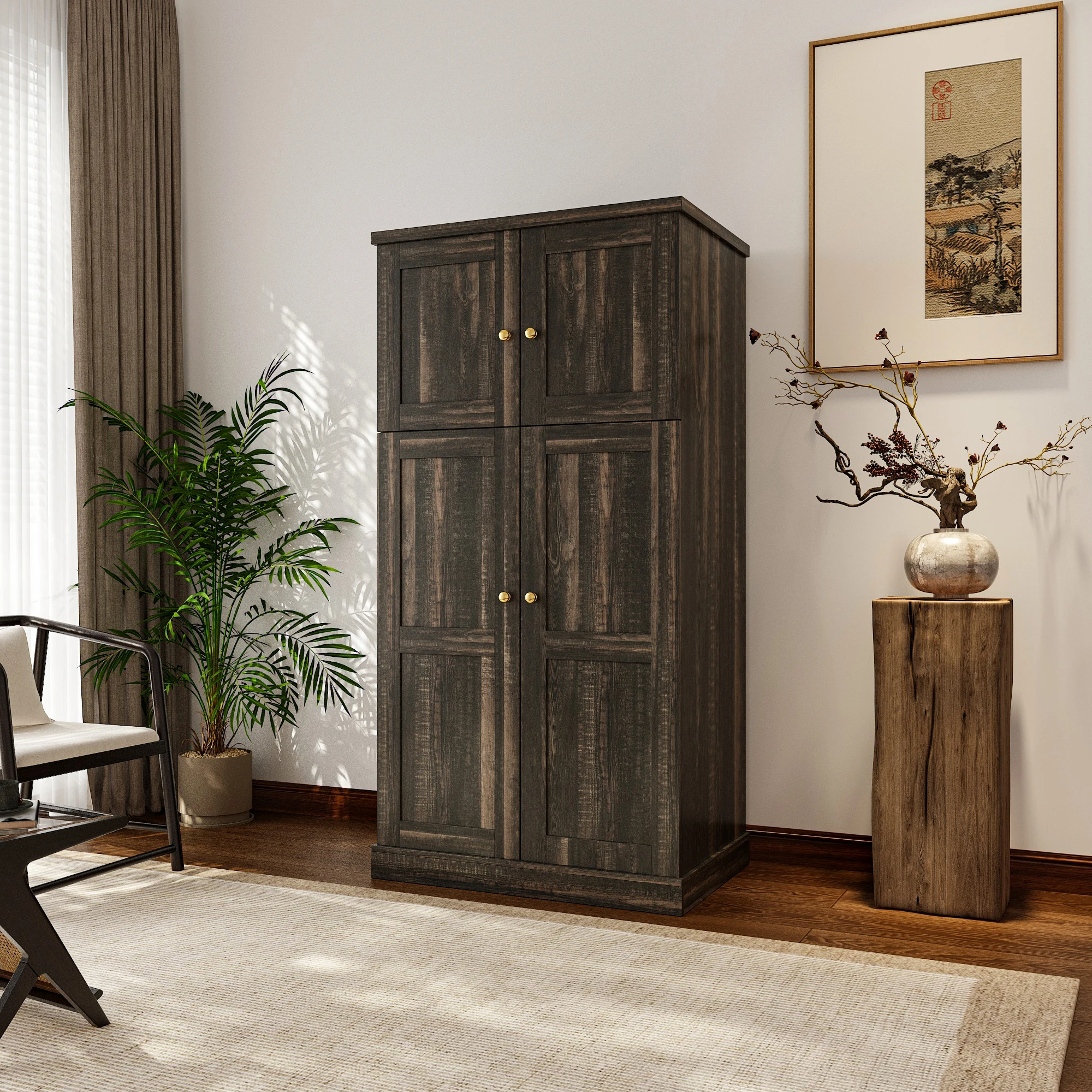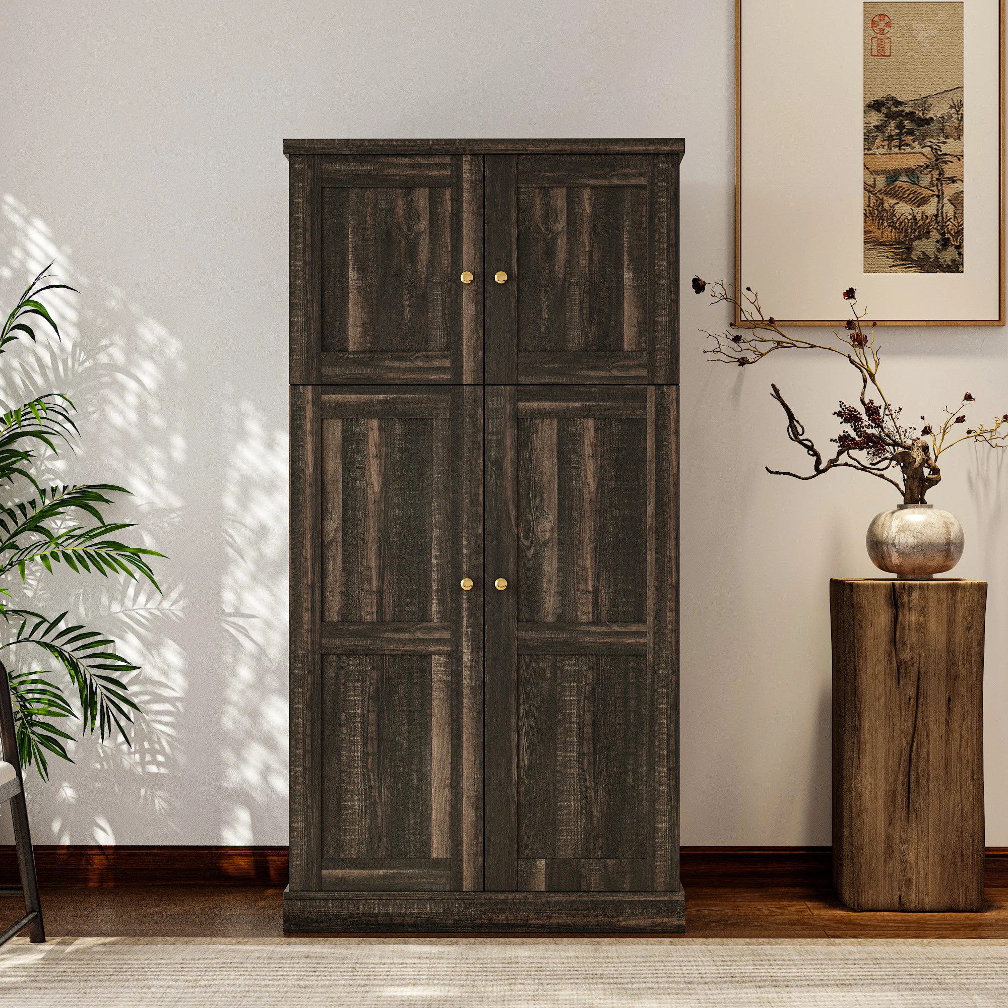This storage cabinet offers several key advantages. Its multi - layer compartments in different sizes enable efficient, categorized storage for clothes, sundries, and small items, keeping spaces organized. With optimized space utilization, it's ideal for compact bedrooms or living - room corners, maximizing vertical space. The rustic wood grain and simple doors give it a versatile look that suits both modern and retro home decor. Constructed from thick boards and quality hardware, its sturdy build ensures durability and high load - bearing capacity. The double - door design opens and closes smoothly, providing easy access to contents.