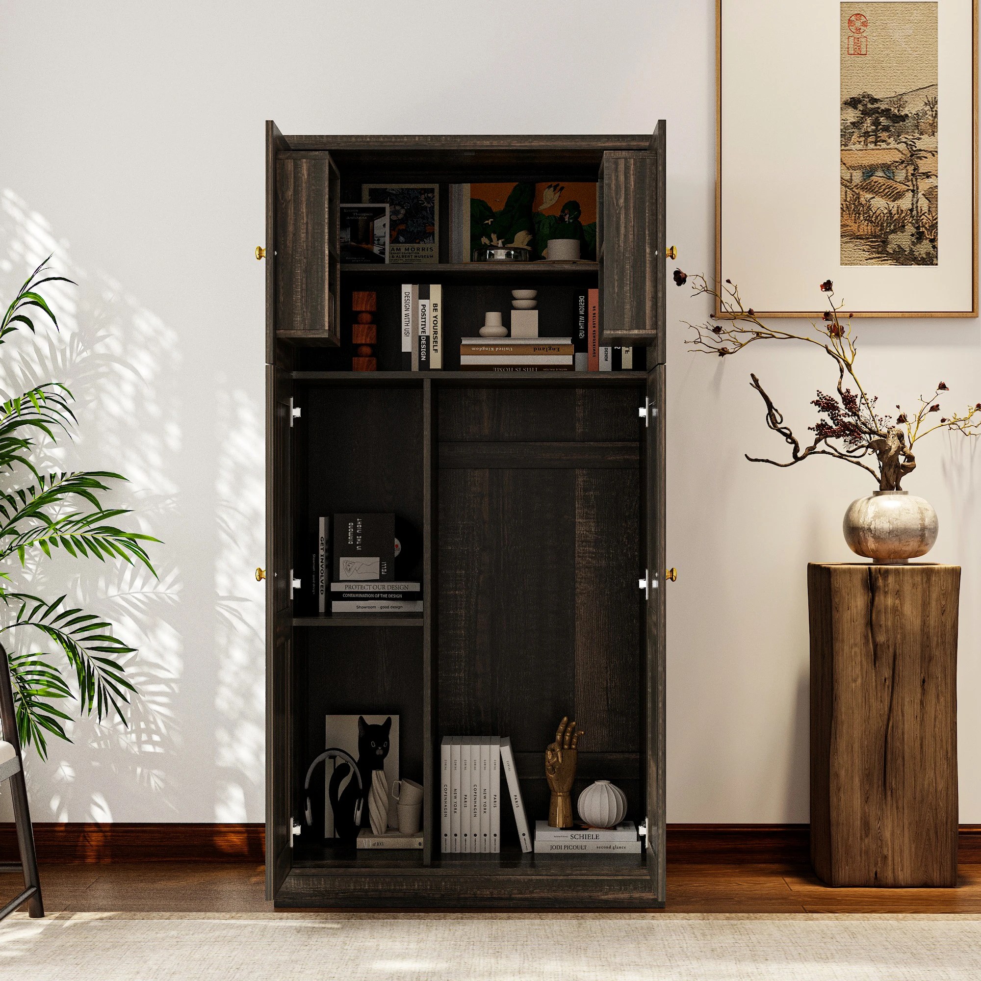 【Smart Layered Organization】Our cabinet features multiple shelves of varying sizes, making it easy to categorize clothes, miscellaneous items, or small gadgets. Say goodbye to clutter and hello to neatness. Featuring a double set of swinging doors, accessing your items has never been easier. You won’t need to struggle with large maneuvers to grab what you need; everyday use is a breeze, simplifying your storage experience!